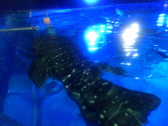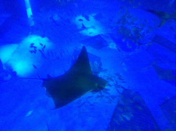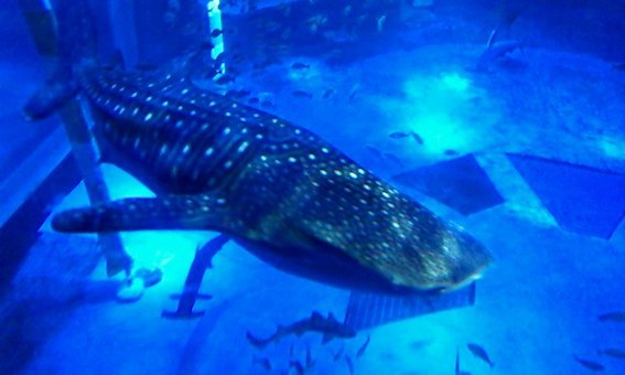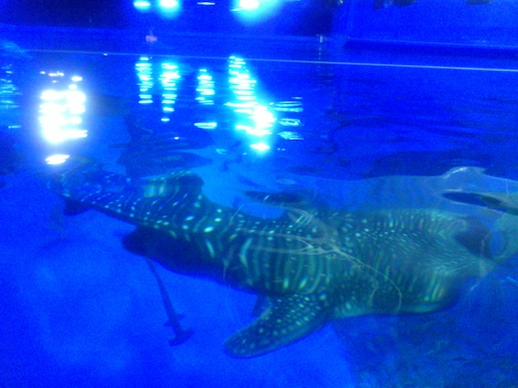 まず,入場してすぐに入った施設には大水槽があり,ジンベイザメが飼われていました.それ以外にも,ハンマーシャーク,エイ等の色々な魚が飼育されていました.水槽の上部から見られるのは珍しい水族館ではないでしょうか?水槽を上部から最下部までをラセン状に回って降りて行き全部を見ることができます.大きいガラスで見応えがあります.